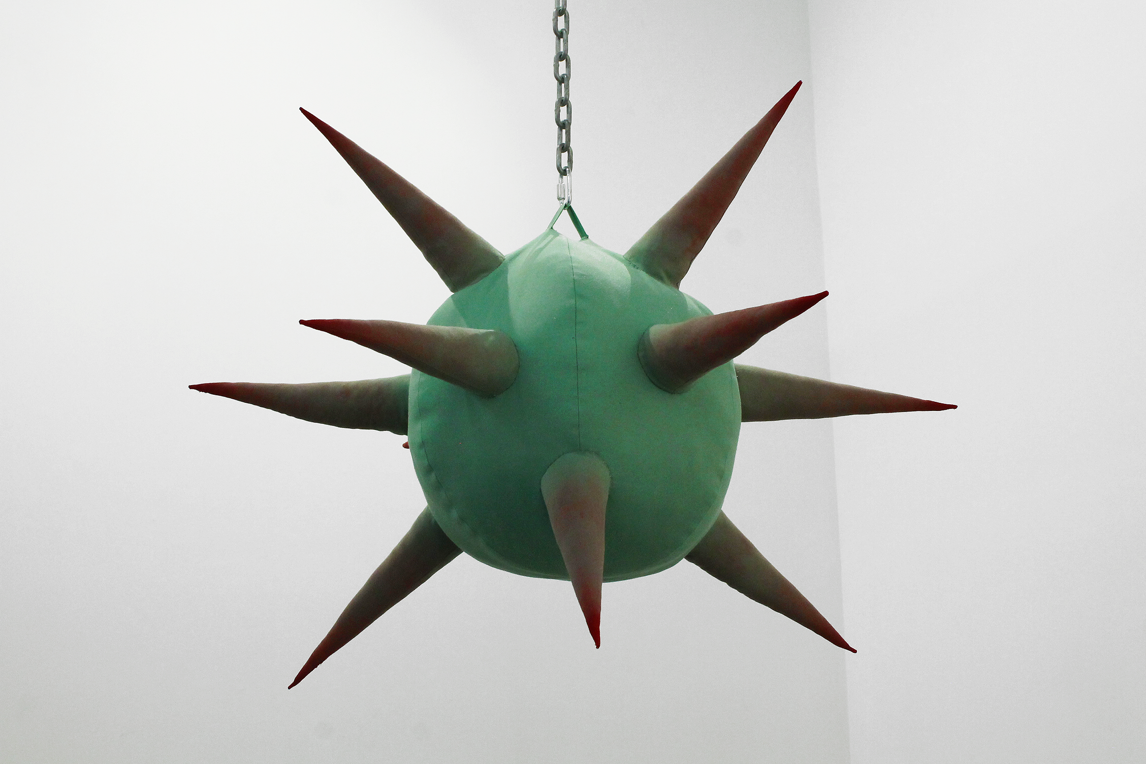 Cotton weave, thread, polyester fiber, acrylic paint, carabiners, chain
