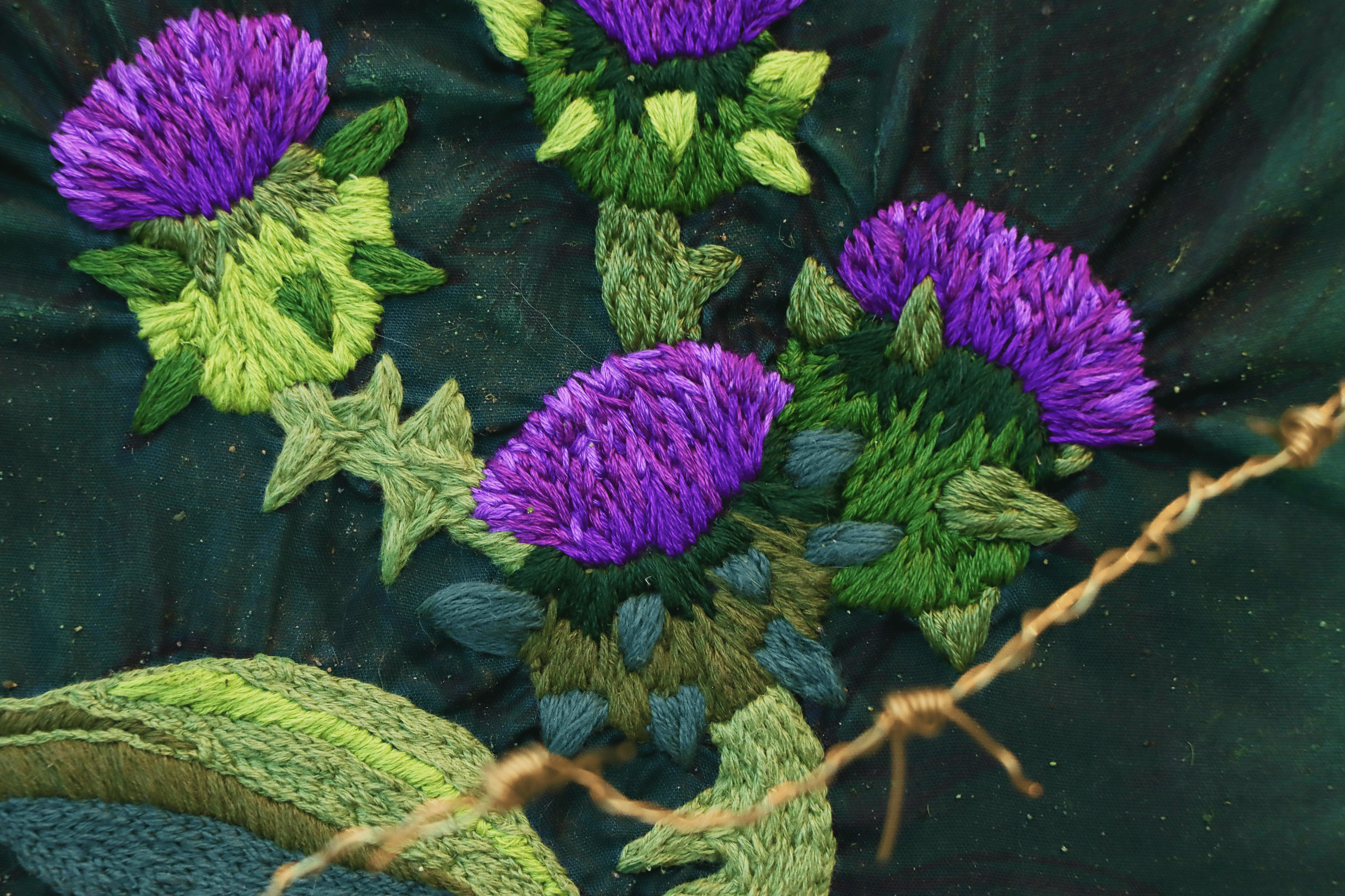 Cotton weave, embroidery floss, acrylic paint, dirt, wire